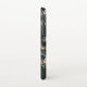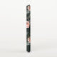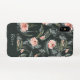 Modern coral tropics pattern, iPhone case. Pattern features, painted tropical green foliage and coral pink flowers on dark jungle green. Single template text line in white script for name.