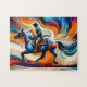 This modern abstract design features a cowboy riding his horse in a swirl of colors.