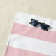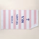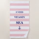 This beautiful beach towel feature is navy blue lettering with an anchor illustration on a pink and white striped background.
