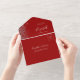 The left-hand edge of this elegant modern all-in-one wedding invitation and RSVP features a silver faux glitter border. The customizable text combines silver gray whimsical handwriting, copperplate and italic fonts on a crimson red background. The return address appears on the outside flap and the reverse side of the detachable RSVP card in silver gray text on solid red.