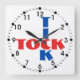 Here's a cool red and blue pattern clock design for any home or office wall. This lightweight acrylic wall clock face has a contemporary designed blue word "Tick" and the red word "Tock" in a crossword puzzle style typography over a white background. The design includes an outer ring of black elements and an inner ring of black numbers.