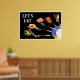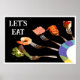 This modern culinary poster was created from one of my original photographs. It features an artistic display of succulent foods balanced on silver Oneida forks, emerging from the edge of a Mikasa Currents pattern china plate. The bold “LET’S EAT” text in the upper left adds a welcoming, contemporary touch.