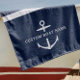 Nautical boating beach towel in navy blue showing an anchor as well as your custom boat name.