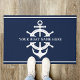 Nautical boating doormat in navy blue reading your custom boat name surrounded by a ship's well and anchor.