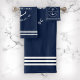 Nautical boating bath towel set in navy blue reading "welcome aboard" as well as your custom boat name and location.