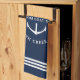 Nautical boating kitchen towels in navy blue reading "welcome aboard" as well as your custom boat name and location.