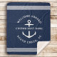 Nautical boating sherpa blanket in navy blue reading "welcome aboard" as well as your custom boat name and location.
