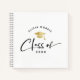 Modern custom name graduation notebook with trendy script calligraphy reading CLASS of under a printed gold grad cap. Personalize with your name in an arch and the year of your graduation.