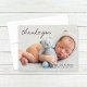 Modern and minimal flat thank you note cards in a horizontal format feature a photo of your newborn baby boy or girl with custom black (can be modified) Thank You overlay text in a cute and stylish heart script font. Perfect to send as a little note of thanks to friends and family who have given gifts to the new baby. As the baby's name and birth statistics are included, this works double-duty as a birth announcement card. Includes space on the back of the card for a handwritten note.