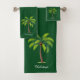 Elegant custom green palm tree and script on forest green Towel Set. Ideal for everyone. Ideal home accent or for a Birthday and Christmas gift. Text can be personalized with your text.