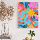 This colorful canvas wall art features abstract art in a color block style in blue, purple, orange, yellow, pink, red, and green with navy blue background and fun doodle shapes like flowers,leaves, circles, squares, and dots