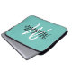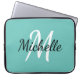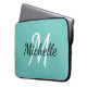 Modern laptop case with a light teal blue background and white custom monogram first initial and first name.