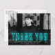 Modern graduation thank you postcard displaying the graduate's horizontal photo with "Thank You" in cyan neon lettering. Personalize the photo graduation thank you postcard by adding the graduate's name, school name, and graduation year. The graduation photo thank you postcard reverses to display your return address and typed thank you message (leave blank to handwrite your own).