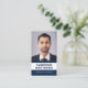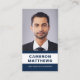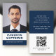 White and dark blue or custom color, modern, professional business card design with template fields for name, company name/title, photo, QR code and contact information. Change background color, move and resize elements with the customization tool.