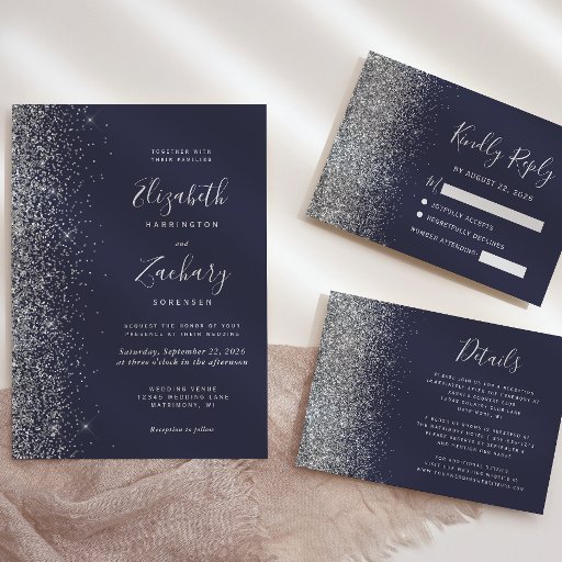 Silver Glitter Whimsical Script Dark Blue WeddingDesigned by Akhates Designs