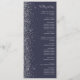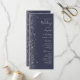 The left-hand edge of this elegant modern wedding program features a silver faux glitter design. The customizable text combines silver gray handwriting, copperplate and italic fonts on a dark navy blue background.