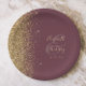 The left-hand edge of these elegant modern wedding paper plates features a gold faux glitter design. Personalize them with the names of the bride and groom in pale gold-colored handwriting script over a large ampersand on a dark burgundy background, with the wedding date below.