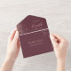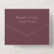 The left-hand edge of this elegant modern all-in-one wedding invitation and RSVP features a rose gold faux glitter border. The customizable text combines rose pink whimsical handwriting, copperplate and italic fonts on a dark burgundy background. The return address appears on the outside flap and the reverse side of the detachable RSVP card in rose pink text on solid burgundy.