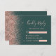 The left-hand edge of this elegant modern wedding RSVP enclosure card features a rose gold faux glitter border. The customizable text combines pale rose colored handwriting, copperplate and italic fonts on a dark green background. The reverse side features a matching dark green and rose gold design.