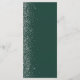 The left-hand edge of this elegant modern wedding menu features a silver faux glitter design. The customizable text combines silver gray handwriting, copperplate and italic fonts on a dark emerald green background. The reverse side features a matching green and silver glitter design.