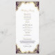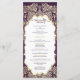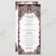 This wedding program card features a striking dark purple background accented with elegant gold damask details for a luxurious and modern look. The front page highlights the couple’s names inside a golden-edged medallion, while the back page presents the full wedding service details framed with decorative flourishes. The rich dark purple tone paired with shimmering gold creates a sophisticated design, perfect for formal ceremonies and keepsake-worthy wedding stationery.