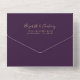 The left-hand edge of this elegant modern all-in-one wedding invitation and RSVP features a gold faux glitter border. The customizable text combines gold-colored whimsical handwriting, copperplate and italic fonts on a dark purple background. The return address appears on the outside flap and the reverse side of the detachable RSVP card in gold-colored text on solid purple.