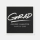 Modern graduation napkins featuring "Grad" displayed in white handwritten lettering with a black background. Personalize the black and white graduation napkins by adding the graduate's name and graduation year. The personalized graduation napkins are perfect for both high school and college graduation parties.