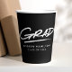 Modern graduation paper cups featuring "Grad" displayed in white, handwritten lettering with a dashed underline on a black background (or color of your choice). Personalize the black and white graduation paper cups by adding the graduate's name and graduation year. The design repeats on the back. The personalized graduation paper cups are perfect for both high school and college graduation parties!