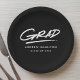 Modern graduation paper plates featuring "Grad" displayed in white handwritten lettering with a dashed underline on a black background. Personalize the black and white graduation paper plates by adding the graduate's name and graduation year. The personalized graduation paper plates are perfect for both high school and college graduation parties!