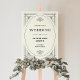 This glamorous black and ivory wedding welcome sign features a modern spin on classic art deco. An ornate, black geometric frame and ornamentation decorate an elegant ivory background for a dramatic, vintage wedding look.