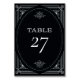 These glamorous wedding table numbers feature a modern spin on classic art deco. An ornate, white geometric frame and ornamentation decorate an elegant dark onyx black background for a dramatic, vintage wedding look.