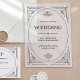 These glamorous clear acrylic wedding invitations feature a modern spin on classic art deco. An ornate, black geometric frame and ornamentation decorate a clear background for a dramatic, luxury vintage wedding look.
