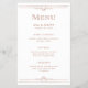 This glamorous wedding menu features a modern spin on classic art deco. Ornate, faux rose gold look geometric borders and ornamentation decorate an elegant white background for a dramatic, vintage 1920's dinner menu look.