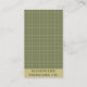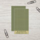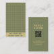 Business card design with a deep green checkered pattern in a clean, minimal layout, featuring a QR code for quick access to a website or portfolio. Suitable for handmade clothing brands, creative professionals, or boutique businesses.