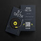 This modern and stylish business card design features a sleek black background with vibrant yellow accents, creating a dynamic and eye-catching look. Perfect for DJs, music producers, and other music professionals seeking a contemporary and memorable design.