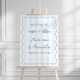 Trendy modern blue and white welcome sign with hand-drawn doodle style elements for a "Two Less Fish In The Sea" wedding shower.