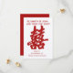 This Modern Double Happiness Save the Date Card consists of the character "double happiness" in Chinese in red glitter, and customizable names, date and location.