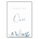 Modern and elegant typography design, table number card. Card features elegant watercolor botanical foliage arrangement in shades of dusty blue and navy. When ordering table number cards, each card must be numbered and ordered individually.