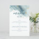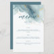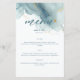 A beach-themed wedding menu template that features a painted, abstract watercolor scene of a beach and waves with a gold ink pour effect (the gold is a digital effect, not real foil!) and modern calligraphy. Classy and elegant, simple and modern, it is a lovely choice for a beach wedding during any season, for a modern couple.