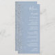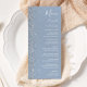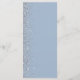 The left-hand edge of this elegant modern wedding menu features a silver faux glitter design. The customizable text combines white handwriting, copperplate and italic fonts on a dusty blue background. The reverse side features a matching dusty blue and silver glitter design.