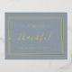 This simple yet modern and elegant dusty blue and foil Thank You postcard is an easy way of sending your heartfelt thanks. "Forever Thankful" is featured boldly across the front along with "Mr. and Mrs." in the foil color of your choice. The text is highlighted by a foiled frame. The blue background can easily be changed to any color of the rainbow. A handwritten note on the back of the postcard gives it a personal touch.