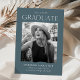 Celebrate your graduate's exciting milestone with these modern photo graduation announcements! The design features the graduation year at the top with "Graduate" shown below in white modern lettering. The graduate's photo is displayed inside of a blue-gray frame with torn edges. Personalize the announcement by adding the graduate's name, school name, and future plans (college, military, career choice, etc.). The card reverses to display a textured blue-gray and white striped pattern.