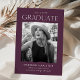 Celebrate your graduate's exciting milestone with these modern photo graduation announcements! The design features the graduation year at the top with "Graduate" shown below in white modern lettering. The graduate's photo is displayed inside of a purple frame with torn edges. Personalize the announcement by adding the graduate's name, school name, and future plans (college, military, career choice, etc.). The card reverses to display a textured purple and white striped pattern.