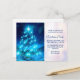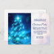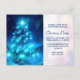 Christmas party invitation postcard with a modern electric blue Christmas tree. Decorated with lights all around. The background has faded blurry lights.