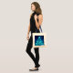 Tote bag with a modern electric blue Christmas tree. Decorated with lights all around. The background has faded blurry lights.