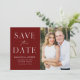 Announce your wedding date with this stylish, modern photo save the date card. The design features "Save the Date" in white serif and script fonts with a burgundy background. Personalize the minimalist save the date announcement by adding your names, date, wedding location, and photo. The card reverses to a solid burgundy background or color of your choice. The simple save the date announcement is perfect for any wedding theme.