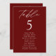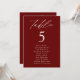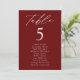 Elegant wedding seating chart featuring "table" displayed in white calligraphy script with the table number and guest names shown below on a burgundy background. The design repeats on the back. To order the table number seating chart, edit each card with the table number and guest names and add it to your cart. Designed to coordinate with our Modern Elegance wedding collection.