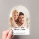 This photo clear acrylic save the date announcement card features a modern arched photo. The design offers curved text and is accented with elegant handwritten script.