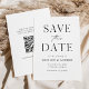 Announce your upcoming nuptials in style with our elegant, modern QR code save the date card. The non-photo save the date features "Save the Date" in black serif and script fonts with a white background. Personalize the front of the save the date card by adding your names, wedding date, wedding location, and other wedding details. The minimal save the date card reverses to feature your custom QR code with wedding website and custom text. Perfect save the date for both modern formal and casual weddings!