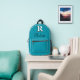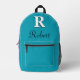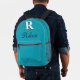 A personalized monogram backpack designed in a modern elegant style. This elegant Blue-Green backpack features a bold white initial 'R' with a black shadow and a customizable name in black script font. Perfect for adding a touch of sophistication and personalization to your everyday style. Ideal for school, work, or casual outings, this backpack combines functionality with a chic design that stands out.